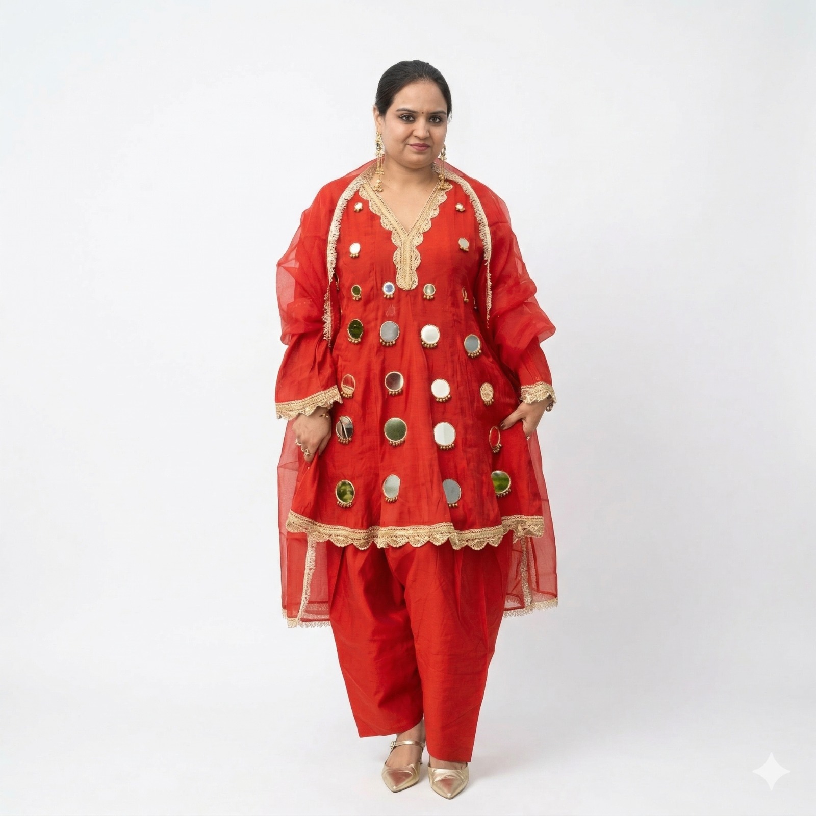 Adorned with intricate mirror work, the suit beautifully reflects festive charm and craftsmanship. Paired with a delicate organza dupatta finished with elegant lace, it perfectly balances richness with subtle sophistication.