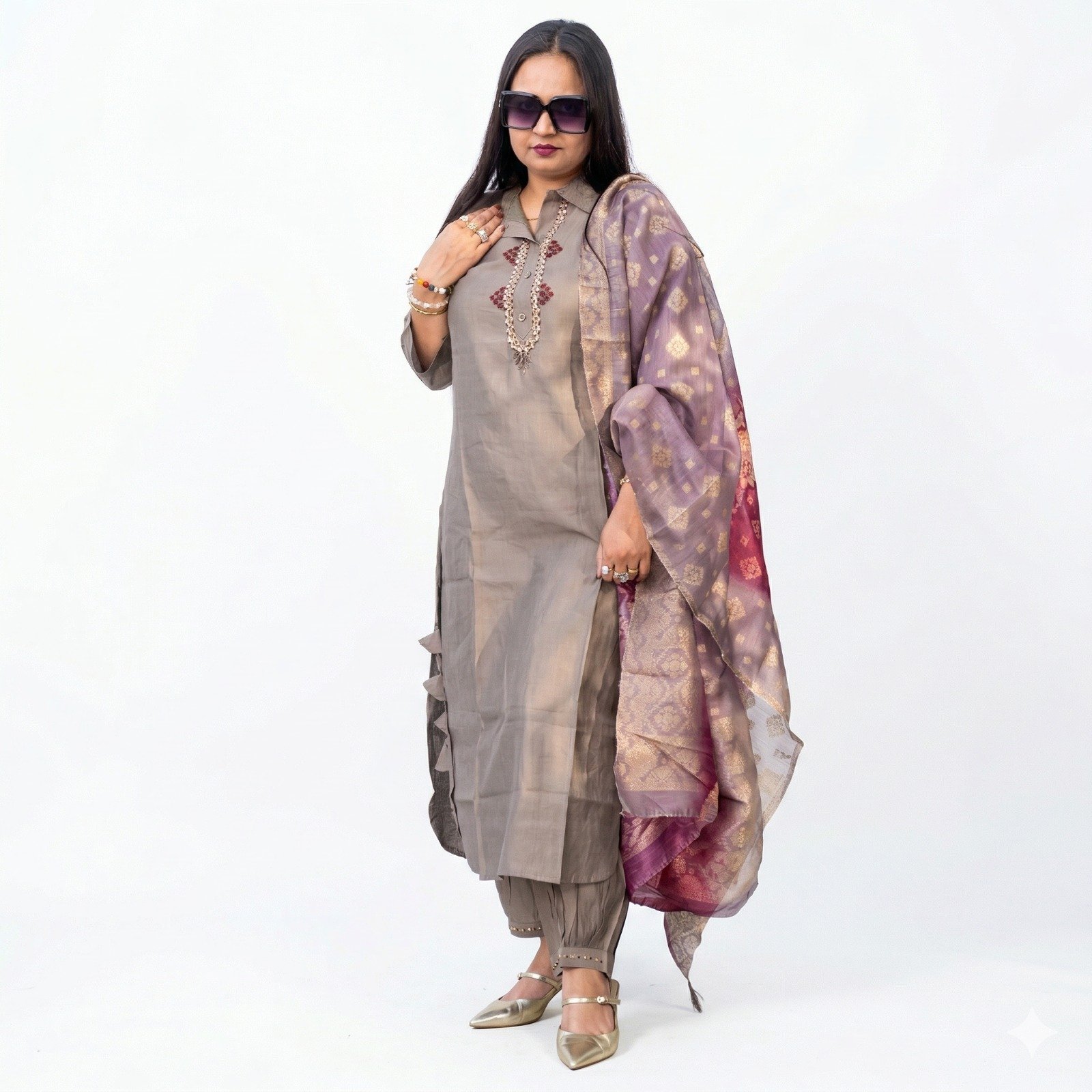 Paired with a trendy Afghani salwar that offers a relaxed yet fashionable silhouette, and a luxurious silk dupatta that enhances the overall look, this ensemble is perfect for both festive and casual occasions.