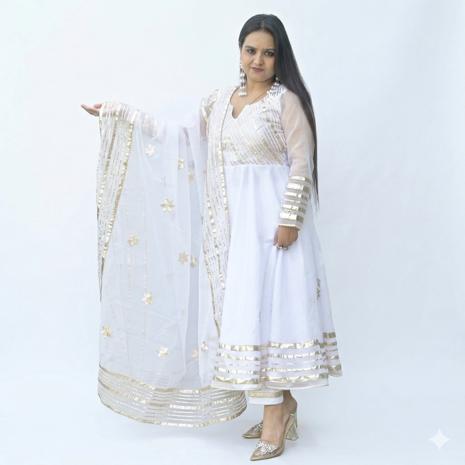 Embrace pure elegance with this stunning white Anarkali frock suit, crafted in luxurious organza fabric for a light, graceful, and premium look. The outfit features a beautifully designed choli fully adorned with intricate gota patti work, adding a rich traditional touch.